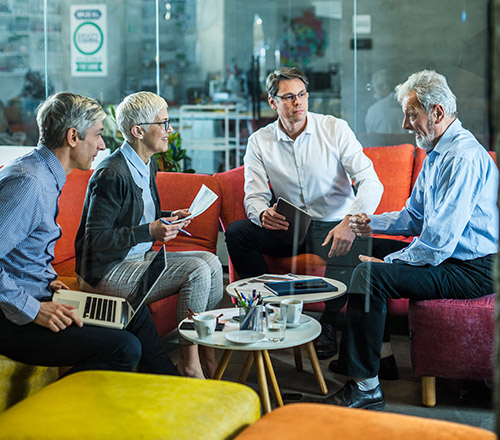 Team of entrepreneurs talking about business reports on a meeting at casual office.